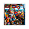 This vinyl sticker would feature Jovial Jasper, the gnome, as a colorful and joyous traveler on his wondrous journey. Jasper is seated inside his iconic, hippie-era Volkswagen van, his twinkling eyes and rosy cheeks emanating warmth and mirth. The gnome's attire is a rainbow of tie-dye patterns, with a pointed hat that spirals upward in a dazzling array of psychedelic colors and patterns. His long, white beard flows like a river of wisdom accrued over countless adventures.