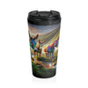 Embark on your daily journeys with the "Kaleidoscope Herd" Stainless Steel Travel Mug, a 15-ounce companion that encapsulates both the practicality of modern drinkware and the enchantment of a fantasy realm. This travel mug takes you on a picturesque adventure to the Aravale Valley, where the mythic and the majestic meet.
