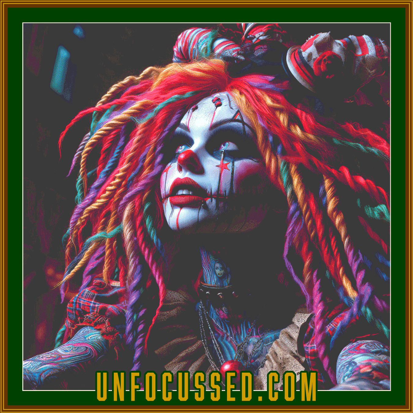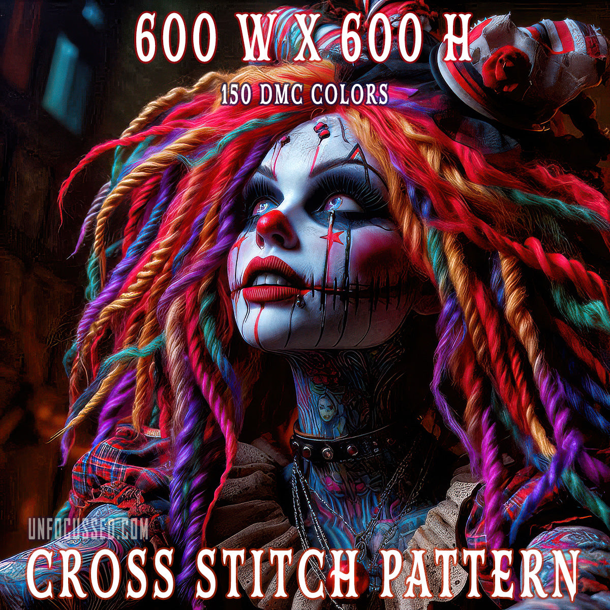 Step into a kaleidoscope of dark whimsy with the "Macabre Muse" cross-stitch pattern! This striking design fuses a hauntingly beautiful aesthetic with a splash of carnival chaos, featuring a mesmerizing portrait of a vividly adorned character with multicolored dreadlocks, bold face paint, and dramatic clown-inspired elements. This masterpiece radiates both gothic allure and artistic rebellion, perfect for stitchers who crave a project that makes a bold statement.