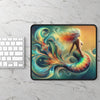 Adorn your workspace with the ethereal beauty of the "Mermaid's Manifestation" mouse pad. This exquisite design captures a mermaid in a moment of serene grace. She is poised as if emerging from the depths of the ocean, her tail and hair flowing into a mesmerizing fractal arrangement. The palette is a dreamy fusion of warm and cool tones, with the scales of her tail boasting a rainbow of colors set against the soft teals and deep blues of the sea's embrace. The upper background fades into a gentle, sun-kissed gradient, adding to the overall mystique. Intricate details and patterns within the fractals suggest an otherworldly complexity, inviting the eye to explore the depths of the design. Perfect for those who delight in the fantasy realm or appreciate the allure of the ocean's mysteries, this mouse pad brings a touch of magic and inspiration to any desk.