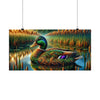The poster features the duck in a moment of peaceful reflection, its image mirrored perfectly in the calm waters below, creating a symmetrical tableau that is both mesmerizing and calming. Surrounding the mallard, the wetland comes to life with whispering reeds and soft cattails that stand tall against the backdrop of the awakening sky. The golden hour light bathes the scene in a warm, ethereal glow, highlighting the intricate details of the duck's feathers and the vibrant ecosystem around it.