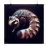 The rich, dark backdrop serves to illuminate the raccoon's fur, which is brought to life with an exquisite palette of blues, oranges, and golds, evoking the warmth of a nebula's glow. The intricate patterns on its tail and back invite you to lose yourself in their complexity, each loop and swirl a story waiting to be unraveled.