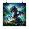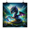 The poster "Mystic Twilight" features a captivating scene where the enchanting serenity of twilight is brought to life by a mystical dragon. The dragon is a magnificent creature with a serene and knowing gaze, its body adorned with scales that have the texture and color of a starlit night sky, transitioning from a deep blue to a gentle lavender. The wings of the dragon, displayed in a poised half-fold, reveal a mesmerizing membrane of purple and pink, reminiscent of the fading evening light. In its claws, it gently holds a crystal orb, within which a miniature tempest of light and magic swirls, reflecting the dragon’s own mystical power.