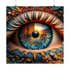 The poster for "Mystic Windows" features a stunningly intricate and surreal portrayal of a human eye. The eye itself is hyper-detailed, with a kaleidoscope of elements that transform the iris into a scene of natural wonder. Within the iris, a majestic forest at sunrise or sunset is visible, with trees bathed in golden light, suggesting the eye is not just a window to the soul, but also to the world's beauty. Surrounding the forest are honeycomb-like structures that transition from a rich amber at the top to a cool blue at the bottom, symbolizing perhaps the fragile boundary between the natural world and its untapped mysteries.
