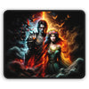 The surface of the pad is a canvas for the eternal tale of contrast and unity. Hades, the stoic ruler of the afterlife, is portrayed in a palette of infernal reds and abyssal blacks, his armor a testament to the unyielding power of the shadows. Across this chthonic landscape, Persephone stands resplendent, her form draped in the life-affirming colors of spring, challenging the darkness with her ethereal light.