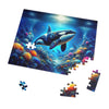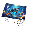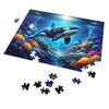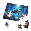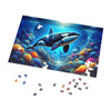 "Explore the mesmerizing depths of the ocean with 'Nebula of the Deep,' a jigsaw puzzle that invites you to piece together the wonders of an aquatic galaxy. Each puzzle piece is a fragment of a grand tableau, featuring a grand orca adorned with swirling, cosmic patterns that reflect the stars above. This majestic creature glides through an ocean alive with neon corals and vibrant marine life, its path illuminated by a cascade of shimmering bubbles.