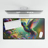 The desk mat showcases the vividly detailed image of Lumin, the mystical hummingbird whose iridescent feathers are a marvel of digital artistry. As she hovers delicately over the spiraling fractal blooms, her wings capture the very essence of motion, creating a sense of gentle dynamism that breathes life into your workspace.