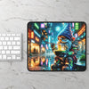 This mouse pad showcases a stunningly vibrant and detailed image that merges fantasy with a cyberpunk aesthetic. The central figure is a gnome with an intricate blend of organic and mechanical features, including a robotic arm and cybernetic enhancements. He's nestled in the heart of a futuristic cityscape, under a cascade of rain, enjoying a hearty bowl of noodles that radiate warmth. Neon signs in various languages illuminate the background, casting reflections on the wet urban streets. The mouse pad's surface offers a smooth glide for mouse movements, while the rubberized bottom ensures a firm grip on the desk. It's a functional piece of art that would inspire and add character to any gamer or creative professional's workspace.