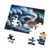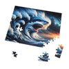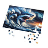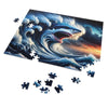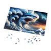 This jigsaw puzzle is an artistic tour de force, capturing the raw power and majestic fury of the ocean. The centerpiece is a colossal wave, transforming into the fierce visage of a shark, its mouth agape revealing rows of razor-sharp teeth. The tumultuous sea around it is a labyrinth of swirling, frothy waters, each crest and trough rendered with exquisite detail, suggesting the churning motion of a tempest-tossed ocean. The background is a dramatic interplay of light and shadow, with the stormy clouds parting to reveal a fiery sunset that bathes the scene in a warm, golden glow. The puzzle, with its dynamic composition and contrasting elements of danger and beauty, promises to be a challenging and rewarding experience for those who dare to piece together the ocean's rage and splendor.