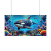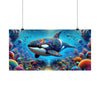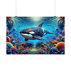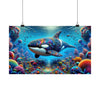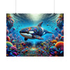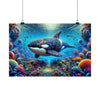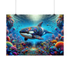 "Orca Odyssey in the Coral Cosmos" - Dive into a vibrant underwater universe where the majestic orca reigns supreme. This fantastical marine landscape bursts with life, featuring a colossal orca adorned with intricate, psychedelic patterns swimming amidst a mesmerizing coral metropolis. Each coral formation teems with vivid colors and otherworldly shapes, creating a lush mosaic of marine biodiversity. Schools of exotic fish dart through the coral structures, adding a dynamic energy to this aquatic tapestry. The scene is illuminated by a dappled light that filters through the water's surface, highlighting the contours and textures of this submerged paradise. This is more than a poster; it's a gateway to an enchanting world beneath the waves, inviting you to lose yourself in the beauty and mystery of the deep blue.