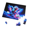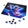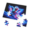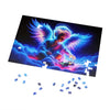 This puzzle, when completed, showcases a brilliant display of colors, from the rich, velvety blues and purples of the angel's expansive wings to the radiant glow of pinks and reds that suffuse the clouds upon which the celestial child sits. The figure's halo and the soft luminescence of the otherworldly atmosphere add a touch of serenity and magic to the image.