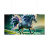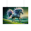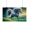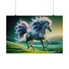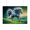 The poster for "Radiant Starlight" would depict an ethereal and majestic zebra in a fantastical setting. The zebra strides gracefully across a lush, undulating landscape of vibrant green hills dotted with pastel-colored flowers. Its stripes create a hypnotic pattern that dances and flows with the creature's movement. The most striking feature is its mane and tail, which burst into an iridescent spectrum of colors, reminiscent of a cosmic phenomenon. Each strand of the mane and tail curls into an intricate spiral, glowing as if imbued with an inner light, mimicking the starlit sky above. The background fades from a twilight green to a deep celestial blue, with hints of aurora-like lights hinting at a world alive with magic. The overall effect is one of wild beauty, untamed energy, and a sense of wonder that captures the viewer's imagination, inviting them to step into a world where nature and fantasy intertwine.