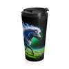 Introducing the "Radiant Stripe" Travel Mug – an enchanting companion for your journeys and daily commutes. This 15-ounce travel mug combines utility with the allure of a fantastical world, featuring the image of a zebra transcended into the realm of the magical. It's not just the zebra's stripes that captivate the eye, but the luminescent, radiant blue that seems to dance and flicker with life against the contrasting black and white. The mane and tail of this majestic creature are reimagined into a spectacle of fractal elegance, swirling in patterns that suggest a mystical energy.