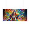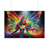 Crafted on premium matte paper, the poster measures 24x36 inches, a size that promises to capture the attention and hold the gaze. The fairy herself is depicted in a flourish of iridescent hues, each feather in her wings a testament to the artist's attention to detail and understanding of color theory. The way the light seems to cascade down her form, illuminating her in a celestial spotlight, gives this piece an almost three-dimensional depth.
