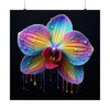 In this mesmerizing image, a realistic rainbow-colored orchid takes center stage against a captivating black backdrop. The orchid appears to defy the boundaries of nature, as its delicate petals melt away, forming mesmerizing rivulets of color that cascade and drip down the canvas. The colors are so vivid and intense that they seem to leap off the image, creating an otherworldly allure. Each petal glistens with a hyper-realistic sheen, capturing the essence of its organic texture and curvaceous form. The contrast between the radiant hues of the orchid and the darkness of the background creates a striking visual impact, drawing the viewer deeper into the mysterious realm depicted. This evocative artwork showcases the extraordinary fluidity and dynamic energy of the natural world, inviting us to contemplate the transient beauty and ephemeral nature of existence.