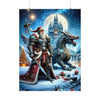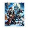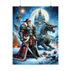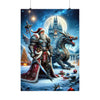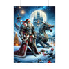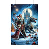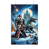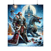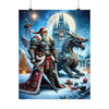 This enchanting poster captures the fusion of Christmas cheer with epic fantasy, featuring a battle-ready Santa Claus as a noble warrior, standing beside a fierce yet majestic dragon. The backdrop is a breathtaking winter wonderland with a grand castle reaching towards a starry night sky, illuminated by a radiant full moon. Santa, clad in ornate, rune-etched armor and carrying a sword that glimmers like a shard of ice, embodies the spirit of a guardian rather than a traditional gift-giver.