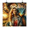 The high-quality print showcases every intricate detail of the fractal forest, the shimmering scales of Azurith, and the ethereal beauty of Elara, rendered in breathtaking colors that seem to glow with their own inner light. The unique design and vivid imagery make this poster a perfect centerpiece, transforming any space into a haven of fantasy and inspiration.