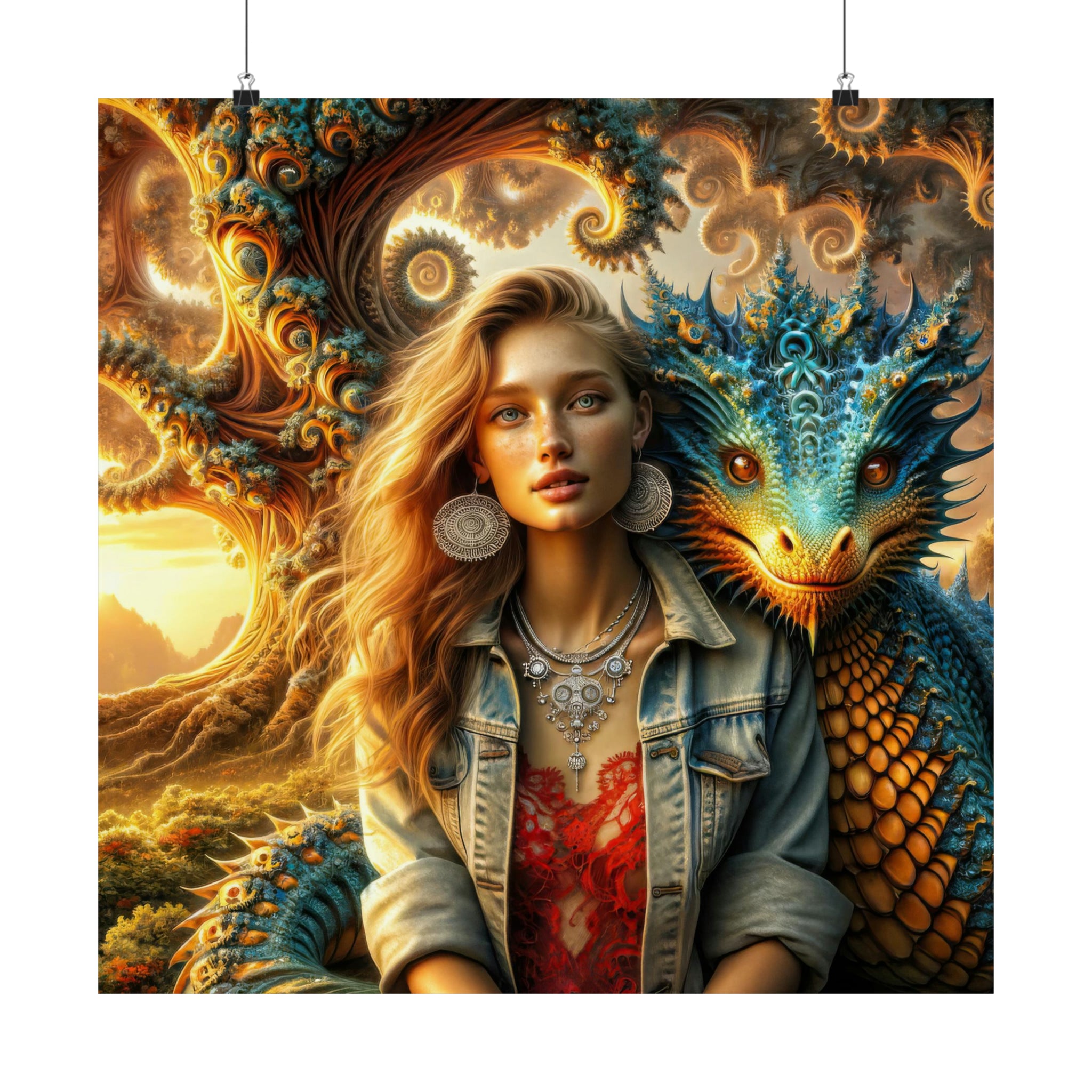 The high-quality print showcases every intricate detail of the fractal forest, the shimmering scales of Azurith, and the ethereal beauty of Elara, rendered in breathtaking colors that seem to glow with their own inner light. The unique design and vivid imagery make this poster a perfect centerpiece, transforming any space into a haven of fantasy and inspiration.