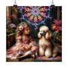 The girl, adorned in a dress with rosy embellishments that echo the garden's natural beauty, exchanges a look of pure affection with her fluffy friend. The poodle's coat, as soft and inviting as the petals that surround them, radiates with a charm only a beloved pet possesses. This visual feast is a celebration of the innocence and joy found in the friendship of a child and her animal companion.