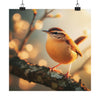 A breathtaking image of a Carolina Wren, captured with stunning attention to detail and hyper-realistic vibrancy. Perched on a tree branch in the early morning light, the bird radiates a sense of tranquility and grace, with a warm mood that is accentuated by the soft, creamy bokeh in the background. The composition of the shot is tight and focused, bringing out the beauty and delicacy of the bird in sharp relief.