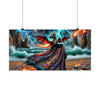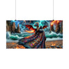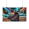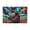 Above them, the heavens are ablaze with electric blue lightning, a raw display of the untamed dance between the dragon's inferno and the tempest's wrath. The ocean's waves crash with relentless power, a testament to nature's unbridled spirit. This poster is not just an image; it's a portal to a realm where the ancient pact between human and dragon maintains the delicate balance of the world. The vibrant colors, the dramatic interplay of light and darkness, and the sensation of a world beyond our understanding make this poster a perfect centerpiece for any room that seeks to inspire wonder and imagination.