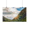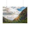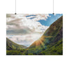 The photo captures the awe-inspiring beauty of Kahului, Maui, with its deep green foliage, magnificent valley, and towering mountains in the backdrop. Against the clear blue sky and the large puffy clouds, the lush greenery of the tropical landscape stands out vividly, while the sun beams radiate down from the heavens, bringing life to the verdant surroundings. The cascading waterfalls and the blooming flowers add to the picturesque and serene atmosphere of the valley floor, making it an idyllic paradise in the heart of Hawaii. This Hawaiian sanctuary is a perfect destination for eco-tourism and a nature lover's delight. The pristine and unspoiled scenery is home to a diverse range of wildlife, making it a true marvel of nature. This breathtaking panoramic vista is one that will stay with you forever, beckoning you to return and experience its harmonious ambiance once again.