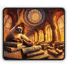 The mouse pad's design features the rich, intricate interior of the grand library, with the cat's sapphire gaze inviting a moment of reflection and a spark of inspiration. It's not just for the cat enthusiast but for anyone who appreciates a touch of mystery and elegance in their daily grind.