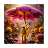 Step into a world where wonder blooms and fantasy reigns supreme. This captivating poster transports you to an ethereal garden, a place where the ordinary bounds of size and scale are joyfully disregarded. At the heart of this lush, vibrant scene is a child clad in a radiant yellow raincoat and bright red boots, a stark contrast to the soft pinks and purples of the oversized flora that surrounds her.