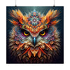 The owl's penetrating golden eyes serve as the focal point, drawing you into a world of ancient wisdom and cosmic secrets. The rich hues of orange, brown, and purple in its feathers are highlighted against the dark, enigmatic background, creating an alluring contrast that promises to be a conversation starter in any room.