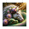 Rendered in stunning detail, the poster features Aeliana's pure white mane and Tharion's emerald scales, both enhanced with subtle fractal patterns that catch the light, creating a mesmerizing prism effect. The dappled sunlight that filters through the image adds a dynamic, almost ethereal quality to the scene, making it a living piece that changes with the room's light.