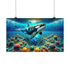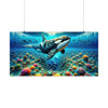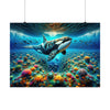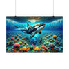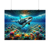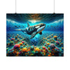 "The Sovereign of Spiral Reefs" showcases an underwater utopia where the majestic centerpiece is an ornately patterned whale, soaring through the azure waters. This magnificent creature's skin is adorned with intricate spirals and delicate filigree, making it appear as if it has been carved from the sea's own lore. Below, the ocean bed is a vibrant tapestry of life, bursting with coral kingdoms of every hue. Psychedelic colors paint a landscape of fantastical flora, providing a sanctuary for schools of fish that weave through the currents. Above, the water's surface mirrors the sky, capturing the dance of light and shadow. This is a world where nature's grandeur is eternally celebrated, a serene yet dynamic vista that promises wonder and ignites the imagination.