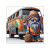 Beside him, the iconic van is a masterpiece of the hippie era, with its body acting as a canvas for intricate floral patterns, peace signs, and sun motifs, all swimming in a sea of warm, inviting colors.