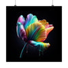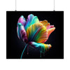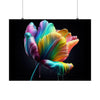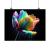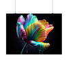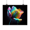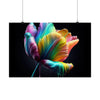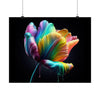 Prepare to be mesmerized by the captivating image of a hyper-realistic rainbow tulip showcased against a black background. Each delicate petal is meticulously detailed as if it is frozen in time. The vibrant colors of the tulip burst forth, with the petals appearing to drip and splash, creating a visually stunning and imaginative work of art.