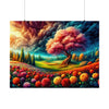 Introducing the 'Twilight's Enchanted Canopy' poster, a mesmerizing visual experience that captures the essence of a magical realm at the very moment day gives way to night. This stunning poster features a majestic tree with a vibrant cascade of pink leaves, standing proudly against a dramatic backdrop of tumultuous storm clouds. The rich, rolling hills of verdant green stretch into the distance, dotted with a dazzling array of dahlias, each petal a burst of color against the impending dusk.