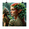 Embrace the mystical allure of the 'Whisper of the Verdant Realm' as you delve into a world where the essence of enchantment blooms amidst the serene whispers of nature. This captivating poster features Aelinor, the guardian faerie of the forest, with her hair aflame in shades of the setting sun, adorned with a diadem of fresh, green leaves that crown her visage, wet with the tender kisses of rain. Each freckle on her skin is a mark of the forest's magic, as if painted by the delicate touch of a woodland artist.