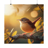 A stunning close-up portrait of a Carolina Wren perched on a tree branch, captured in the warm light of early morning. The tight composition of the shot gives the image a sense of intimacy and serenity, while the soft creamy bokeh creates a beautiful contrast against the sharp, detailed quality of the bird's feathers and patterns.