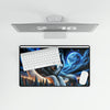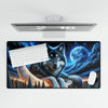 Crafted with precision, the desk mat showcases the luminous guardian of the night – a wise, majestic wolf resting upon the crescent of a dreamlike moon, against a tapestry of the star-studded sky. The wolf's eyes, a vivid blue, hold the calm of the night and the wisdom of the forest, inviting you to draw inspiration from the serene and untouched wild.