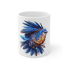 This ceramic mug features a stunningly intricate illustration of a bluebird. The bird's feathers are rendered in a swirling pattern, with a mesmerizing blend of blue hues that range from deep navy to a delicate sky blue, accented with touches of orange, cream, and tan for a vibrant contrast. Each feather is detailed with fine lines, giving the impression of texture and depth. The bird's eye is sharp and clear, a spot of calm in the midst of the feathered whirlwind. The overall effect is one of dynamic beauty, as if the bird's essence is captured in a moment of fluid motion. The design wraps around the mug, offering a glimpse of avian artistry from every angle. It's a piece that would appeal to bird lovers, art enthusiasts, and anyone who appreciates the exquisite detail of wildlife illustration.