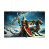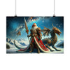 Santa, with his flowing beard and iconic red hat adorned with holly, holds a spear that seems to have been forged from the very essence of winter's first snowflake. His red cloak, speckled with snowflakes and lined with fur, billows against the crisp winter air, echoing the festive joy of the season.