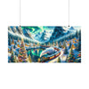 The Yuletide Express, an old-world steam train, billowing puffs of smoke as it winds through a vibrant and picturesque winter landscape. With a painterly touch, the scene is brought to life through vivid colors and dynamic brushstrokes that give texture to the snow-covered pines, the rustic mountain cabins, and the rugged alpine backdrop. The Northern Lights unfurl in the sky with artistic flair, casting a dance of green and pink illumination that reflects on the serene surface of a mountain lake. The train itself is adorned with festive wreaths and ribbons, its windows glowing warmly against the crisp winter air. A grand Christmas tree, decorated with colorful bulbs and topped with a shining star, anchors the scene, symbolizing the joy and spirit of the holiday season. This poster would invite onlookers into a storybook world where the season's joy radiates through the cold, where every snowflake and star seems to celebrate the magic of Yuletide.